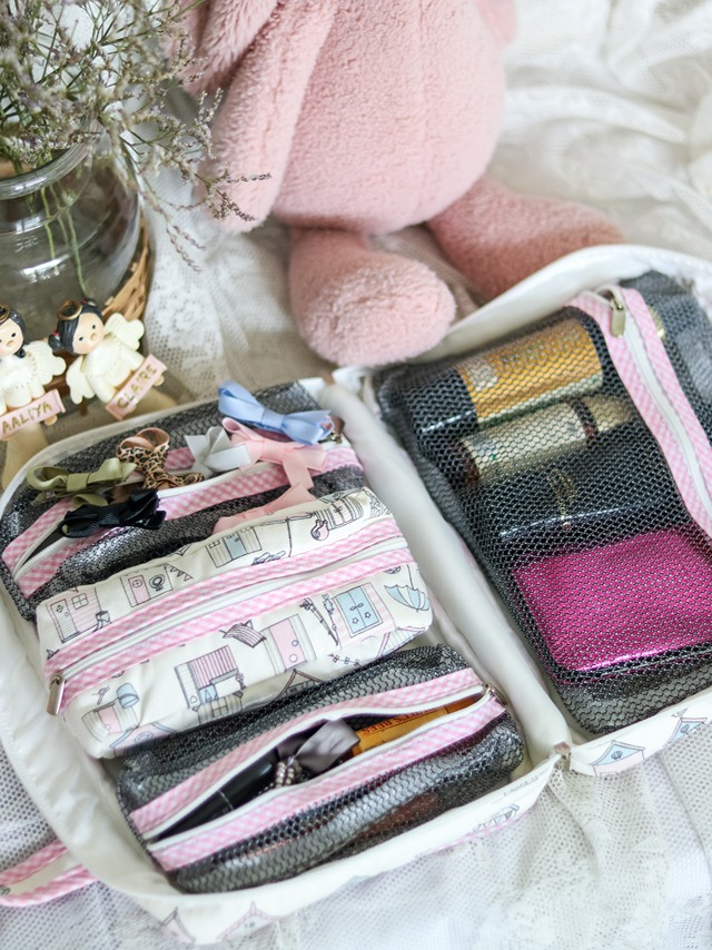 Includes: Fabric Bag, 3 rectangle pouches and 1 squarish pouch
